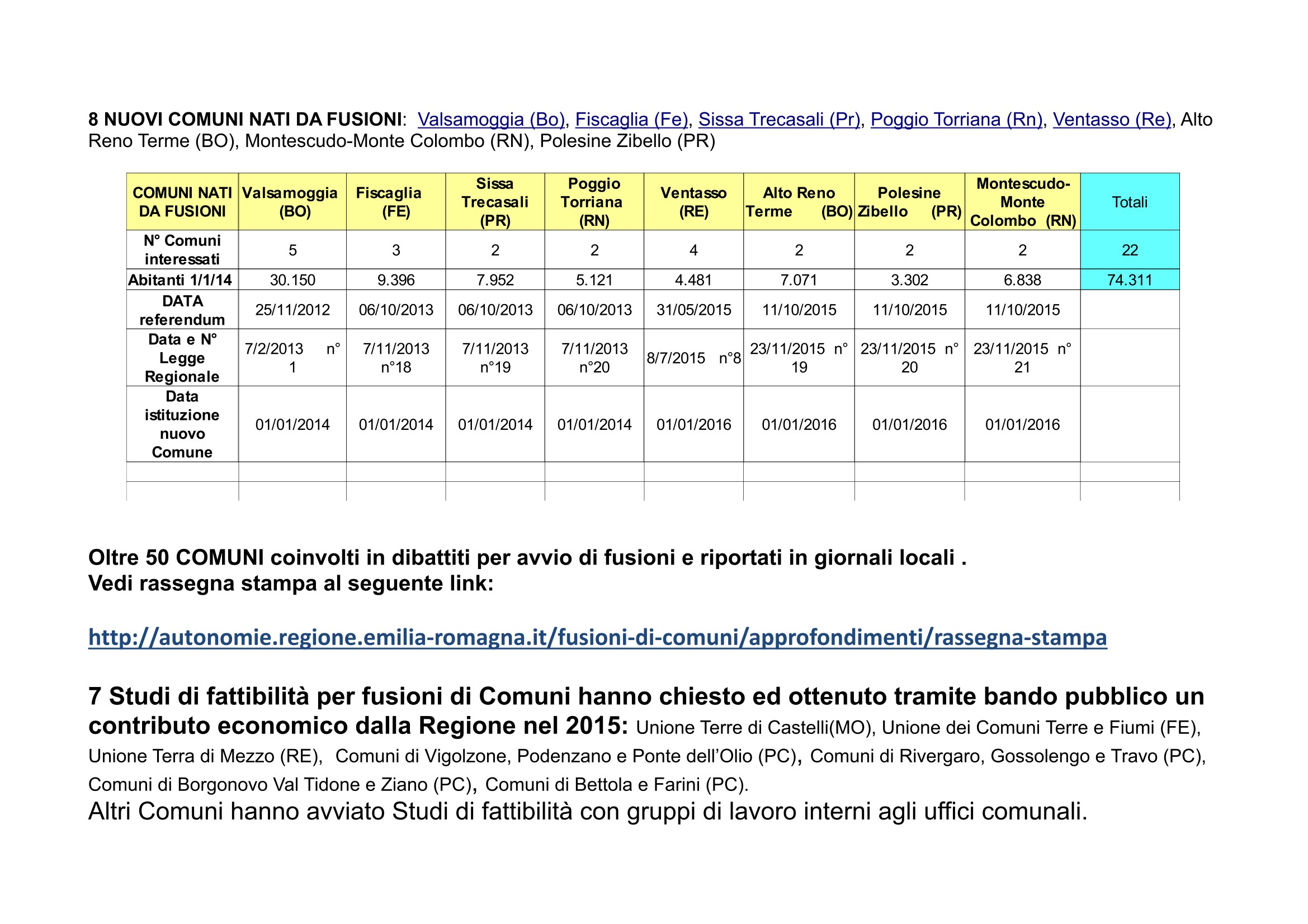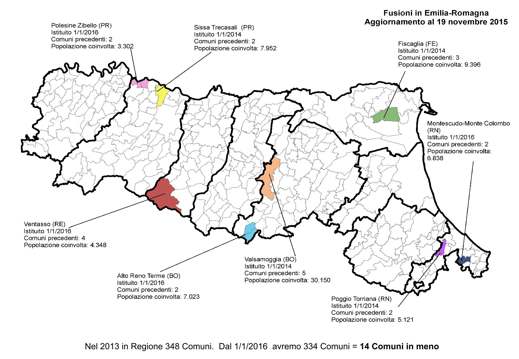 I benefici li stanno già godendo i 53.000 abitanti dei 4 Comuni nati da fusione nel gennaio 2014 in Emilia Romagna: Valsamoggia (BO), Fiscaglia (FE), Poggio Torriana (RN) e Sissa Trecasali (PR). Altri 21.000 cittadini emiliano-romagnoli si sono espressi a larga maggioranza nei referendum tenuti nel 2015 per la istituzione di altri 4 nuovi Comuni che nasceranno il 1 gennaio 2016 dalla fusione di 10 Comuni: Ventasso (RE) dalla fusione di Busana, Collagna, Ligonchio e Ramiseto; Alto Reno terme (BO) dalla fusione di Granaglione e Porretta Terme; Montescudo-Monte Colombo (RN) dalla fusione di Montescudo e Monte Colombo; Polesine Zibello (PR) dalla fusione di Polesine Parmense e Zibello.
